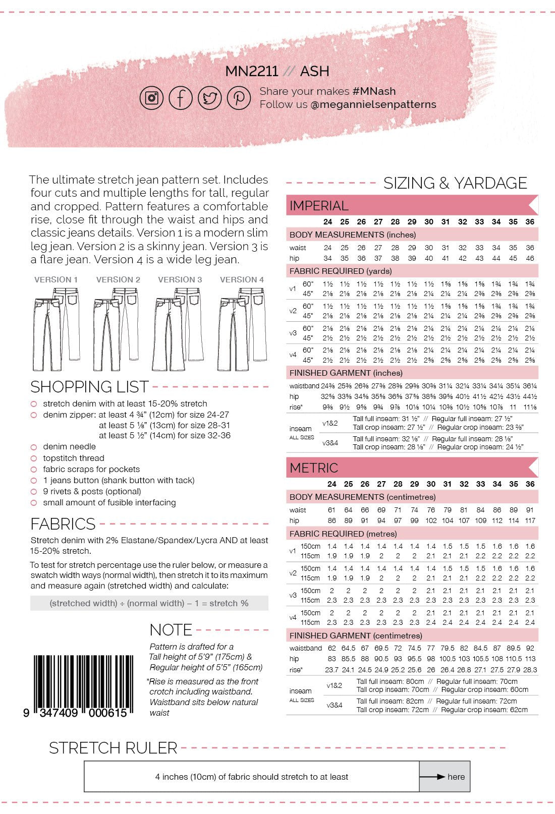 The ultimate stretch jean pattern set. Includes four cuts and multiple lengths for tall, regular and cropped. Pattern features a comfortable rise, close fit through the waist and hips and classic jeans details.