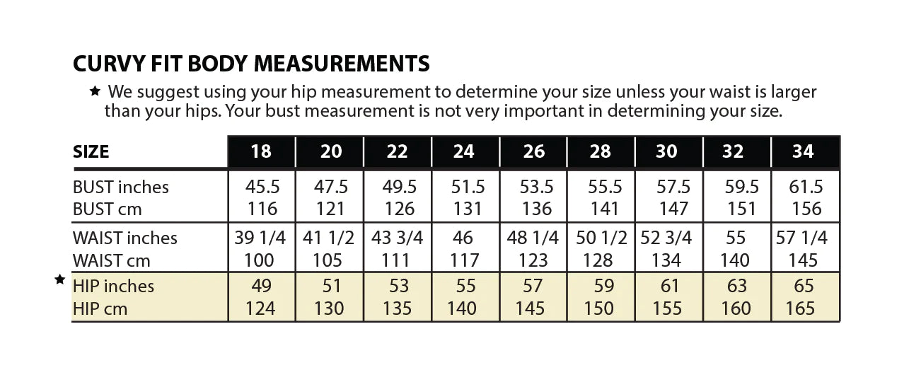 Includes sizes 18 - 34 (waist sizes 100cm - 145cm).