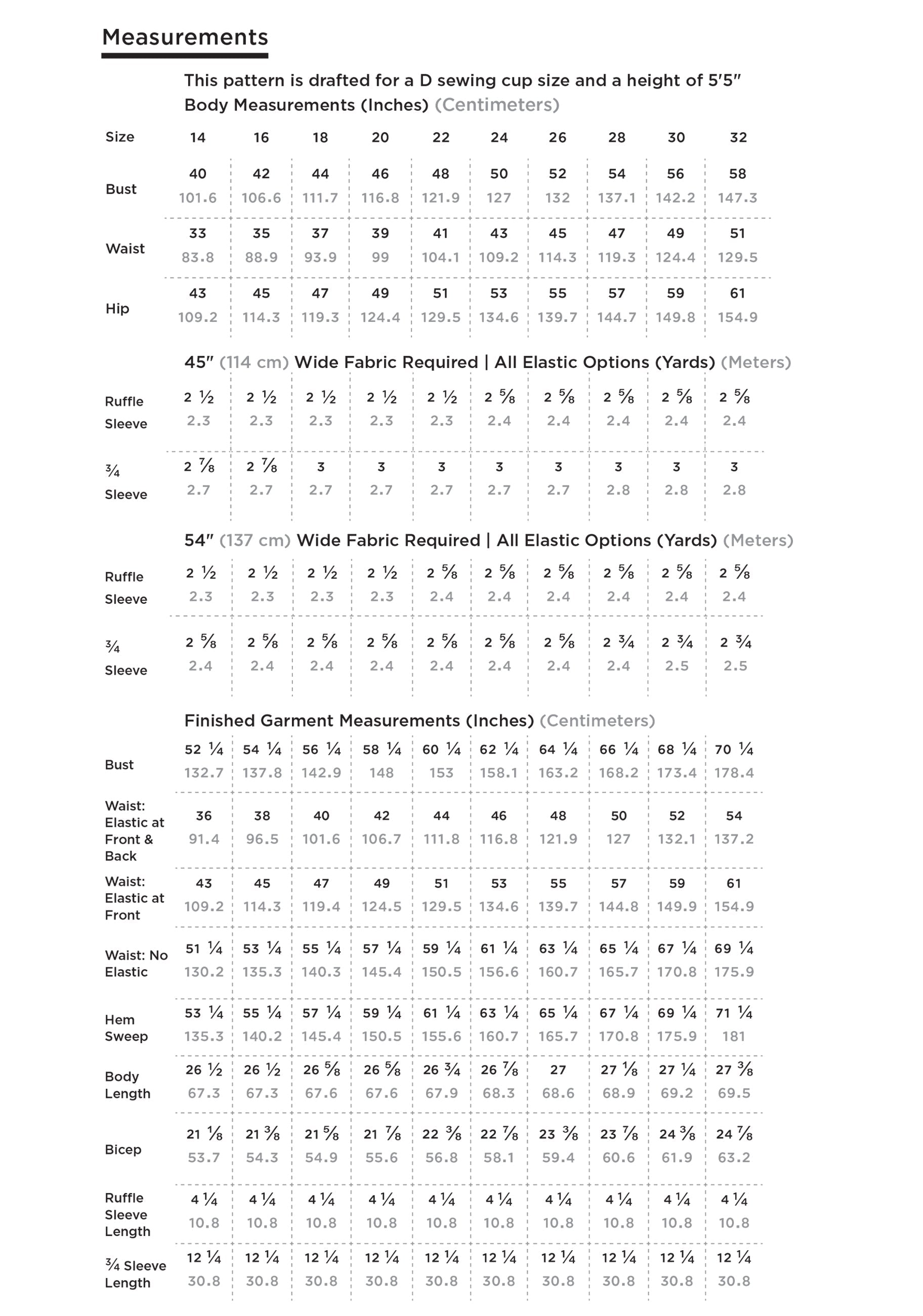 Includes sizes 14 - 32 (40" bust - 58" bust). Drafted for a D sewing cup size and a height of 5'5".