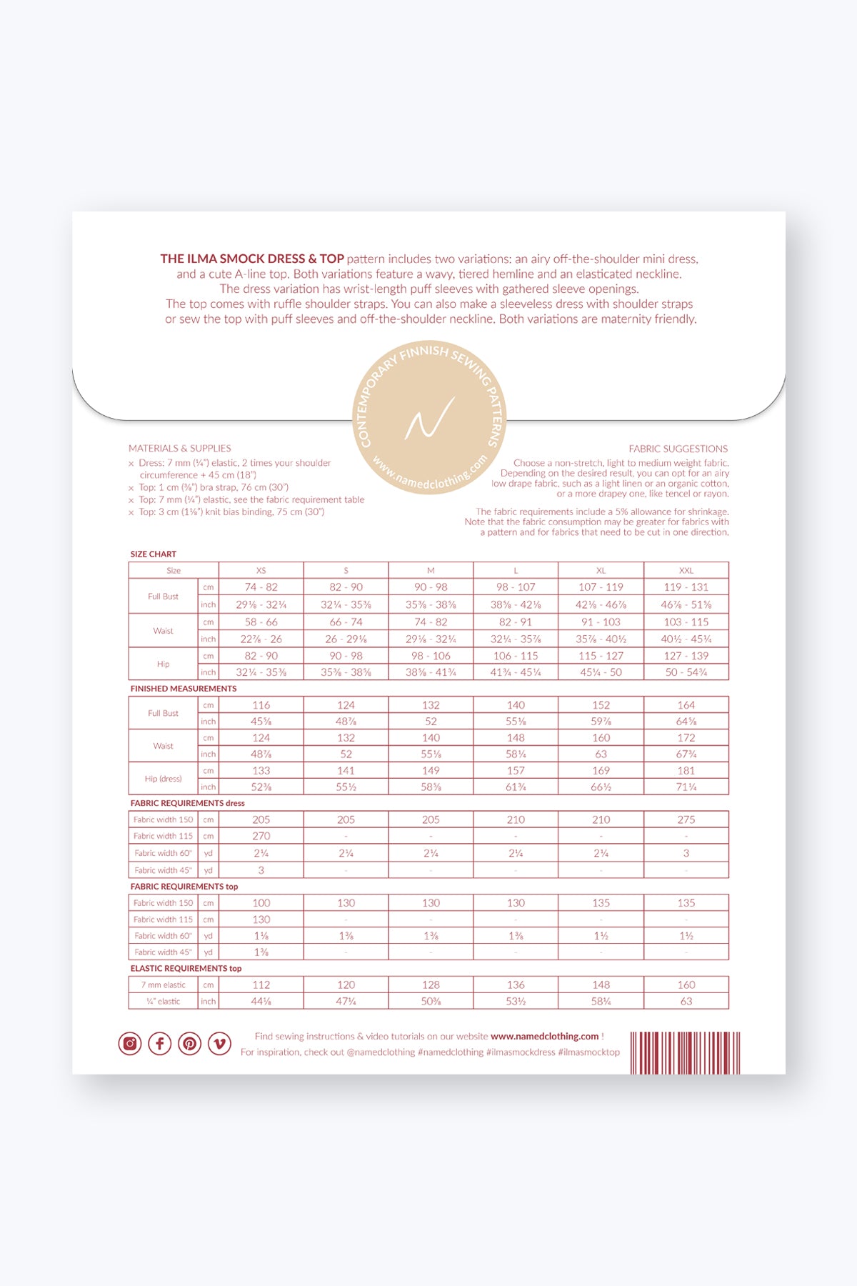 - Top: 7 mm (1/4”) elastic, see the fabric requirement table