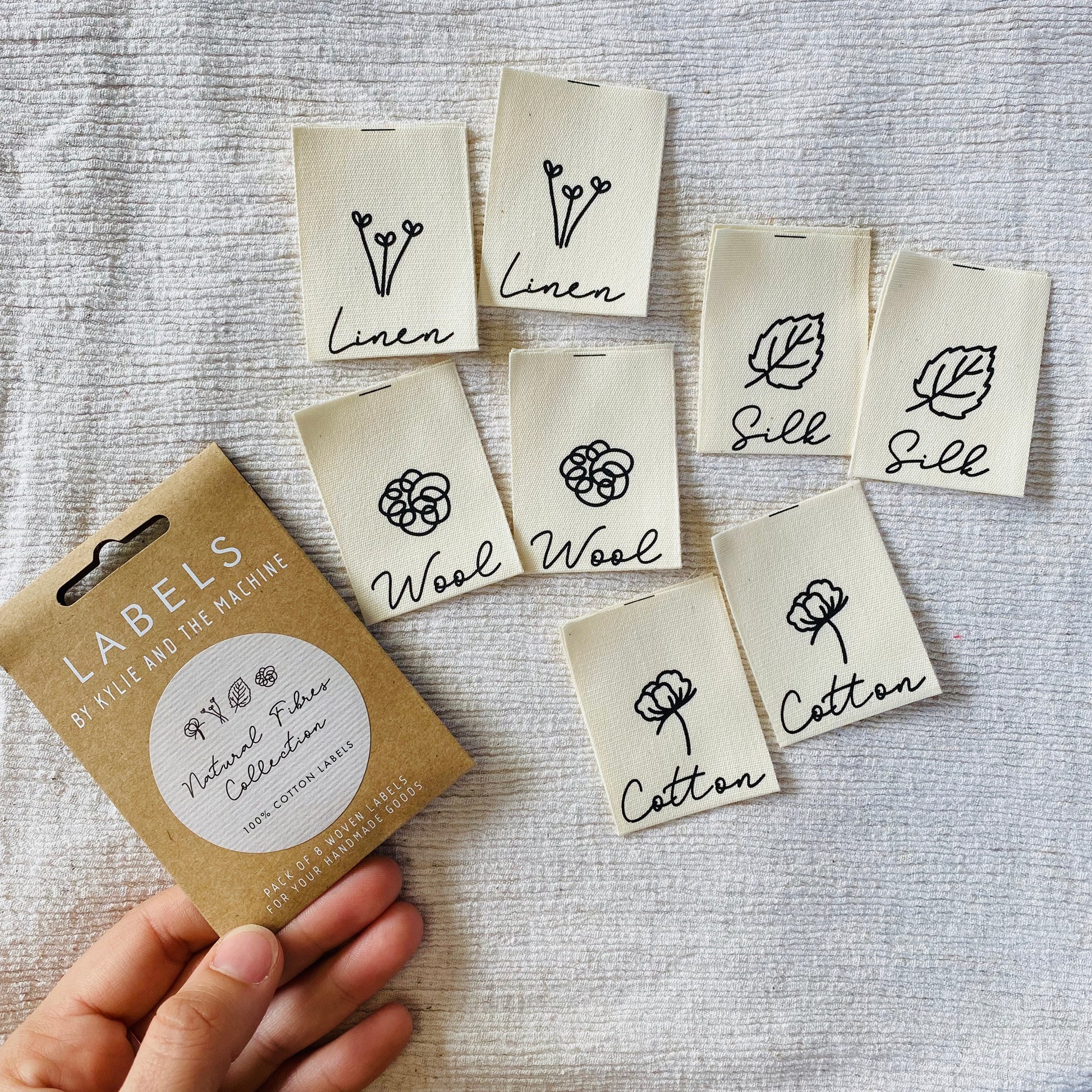 Please note, different to the Kylie and the Machine polyester woven labels, the two raw edges (parallel to the fold) of these labels can fray. This just means you must sew both of the raw edges into a seam, or fold the edge before sewing, or use some fray check solution if you'd like them to be exposed. It's recommended to sew both into the seam (as shown in the example photos).