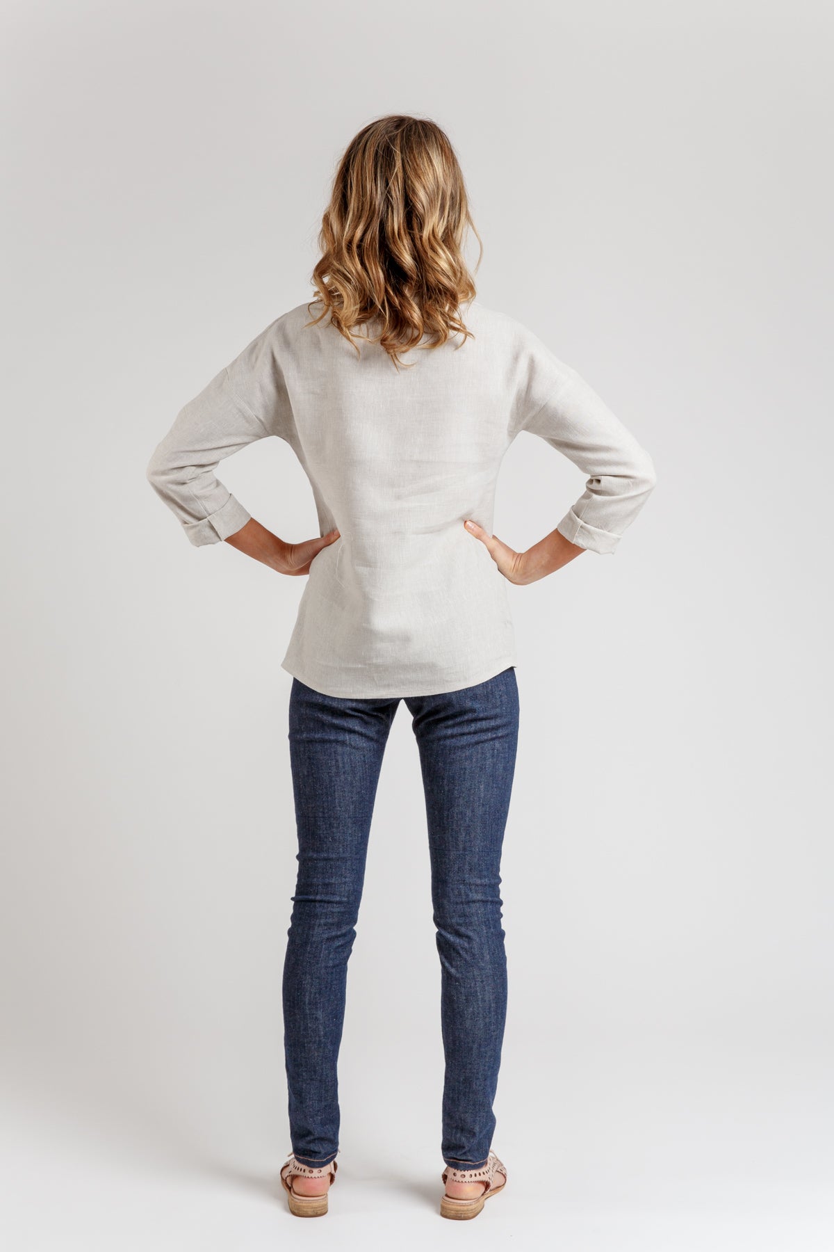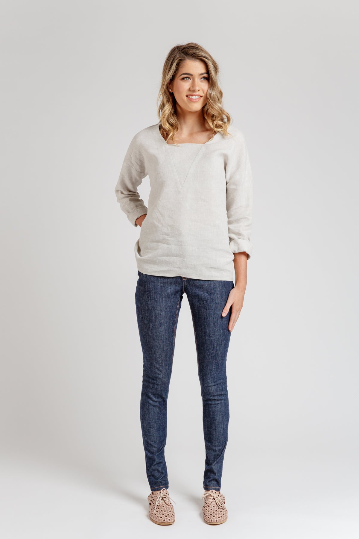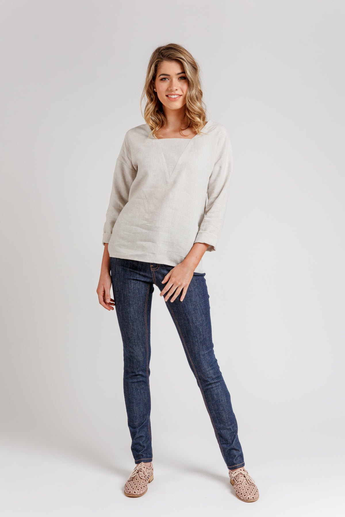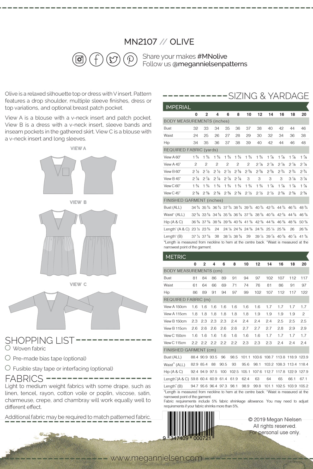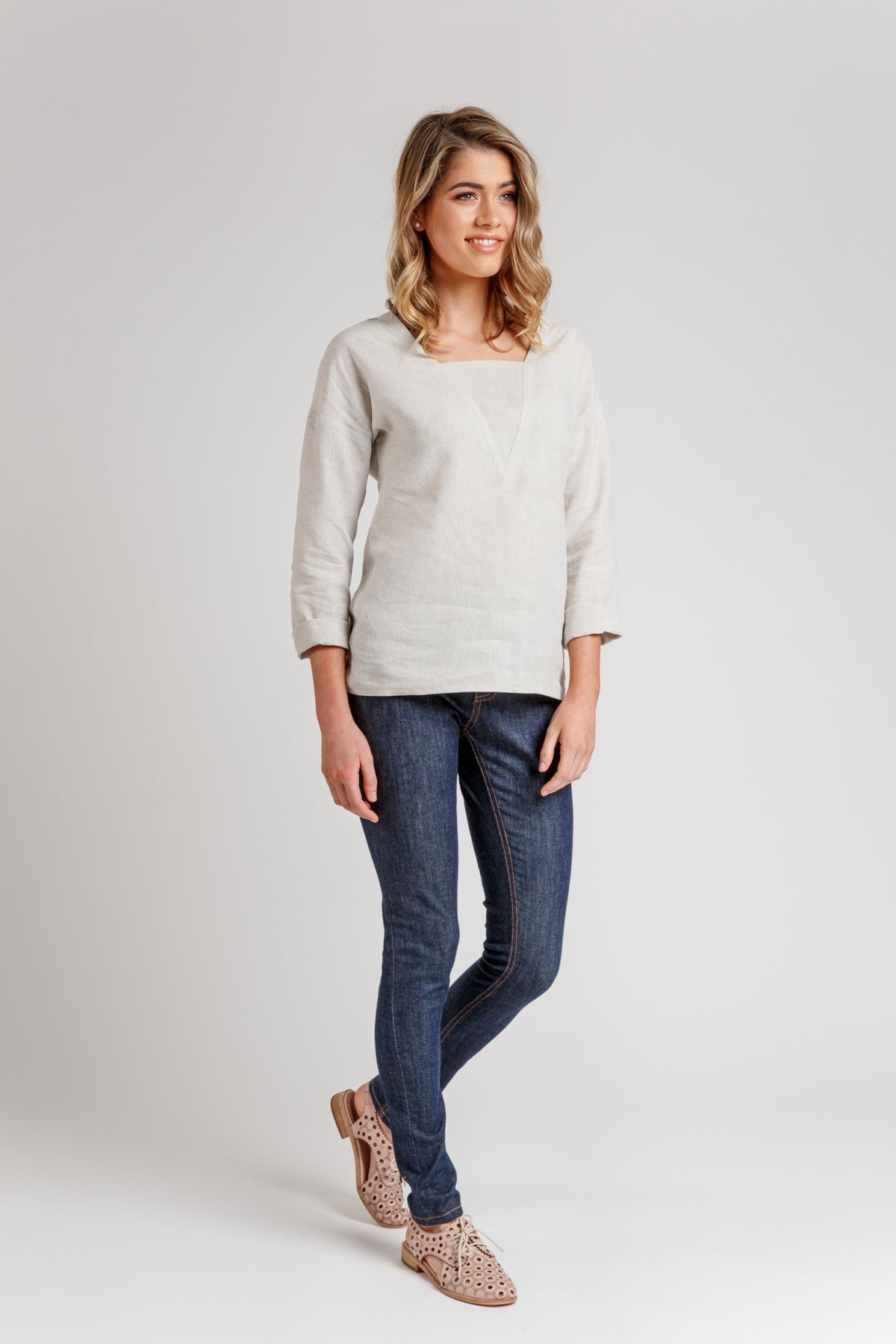 Olive is a relaxed silhouette top or dress with v-insert. Pattern features a drop shoulder, multiple sleeve finishes, dress or top variations, and optional breast patch pocket.