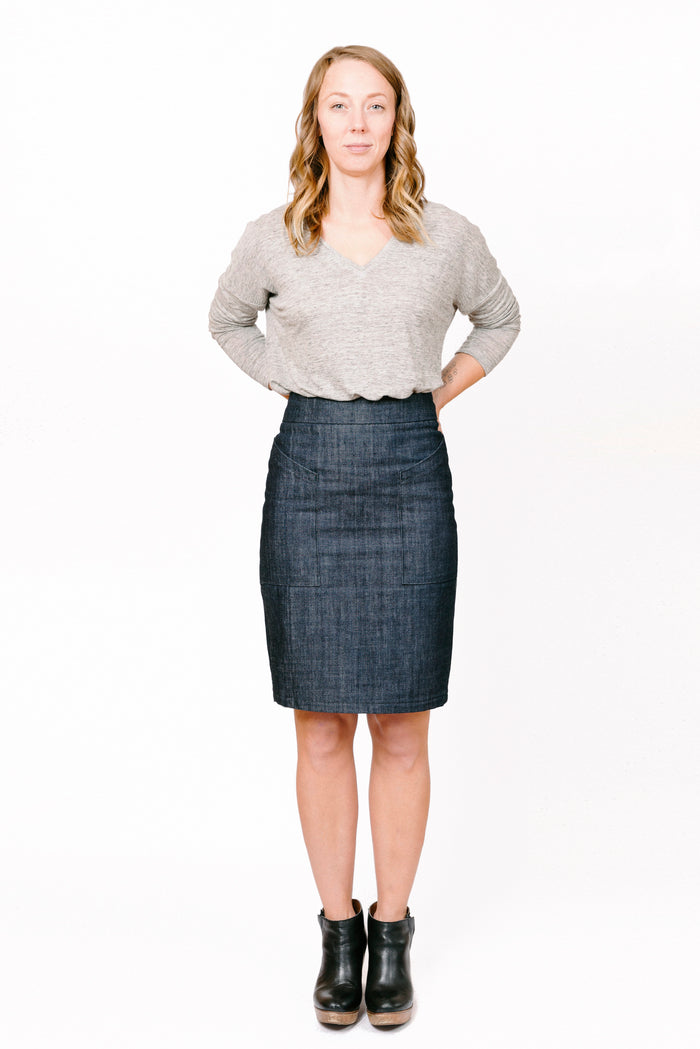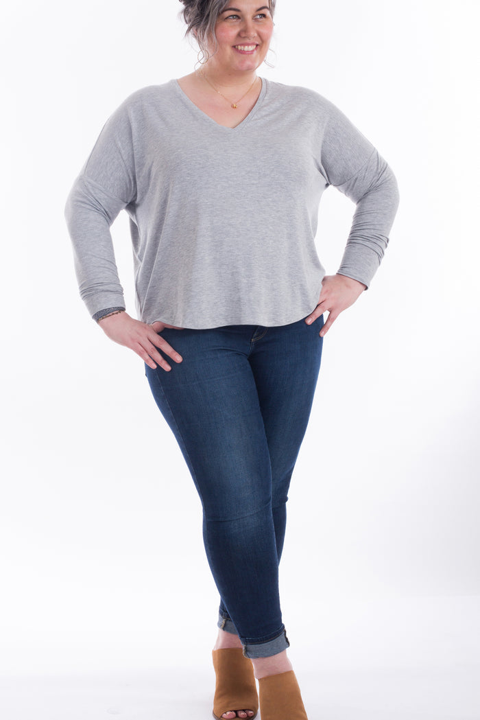 The Tabor V-neck is a versatile top that can be dressed up or down. It features a loose fit, drop shoulders and various necklines and body lengths. The oversized body width is most compatible with lightweight, fluid knits with at least 25% stretch.