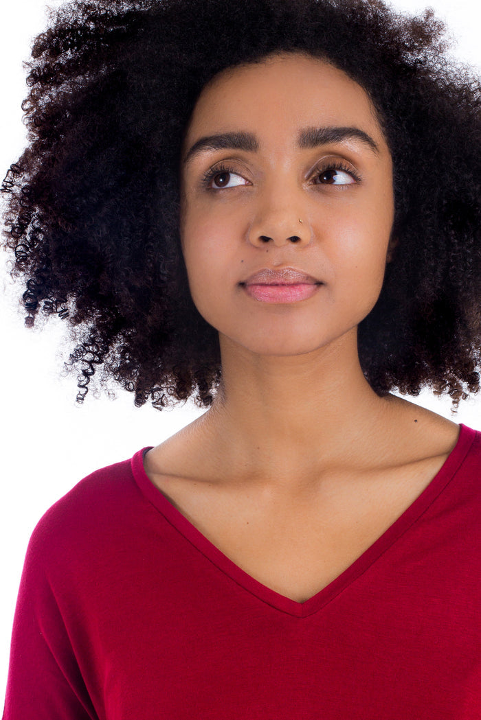 The Tabor V Neck has many versions, but all feature drop shoulders and a loose fit through the body.