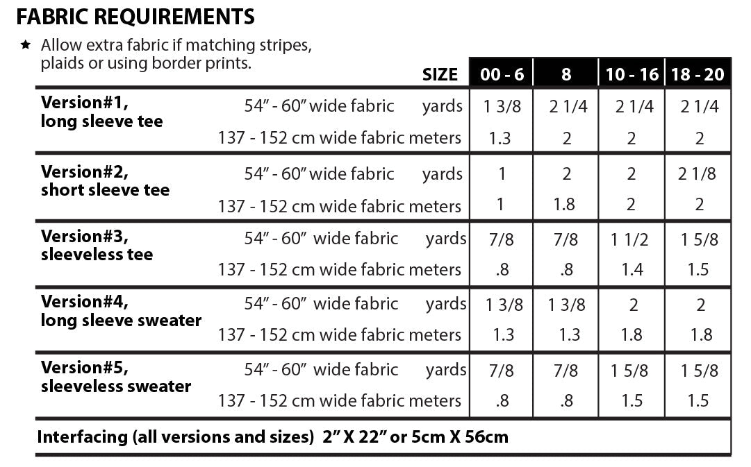 Versions #4-5 are designed for sweater knit fabrics with at least 25% stretch. Choose natural fiber sweater knits such as wool jersey, novelty sweater knits and softer rib knits.